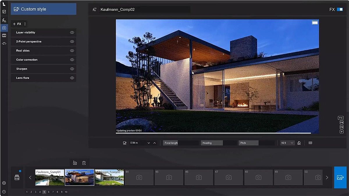 在 Lumion 中調整焦距允許您控制場景的可見程度以及如何描繪對象之間的空間關系。你可以找到 焦距 在照片模式下的預覽窗口下滑塊。為了在其上下文中有效地捕捉建筑設計,建議使用 24-35 毫米的范圍。