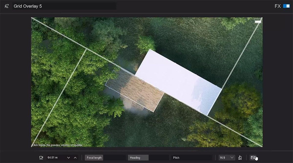 要將渲染與現有照片匹配,照明和天氣條件需要完全相同。Sun studies (太陽研究) 效果可以通過模擬世界特定部分在特定日期或時間的照明條件來幫助實現此目的。在照片模式下的 +FX 中找到它,打開它,然后相應地調整設置。