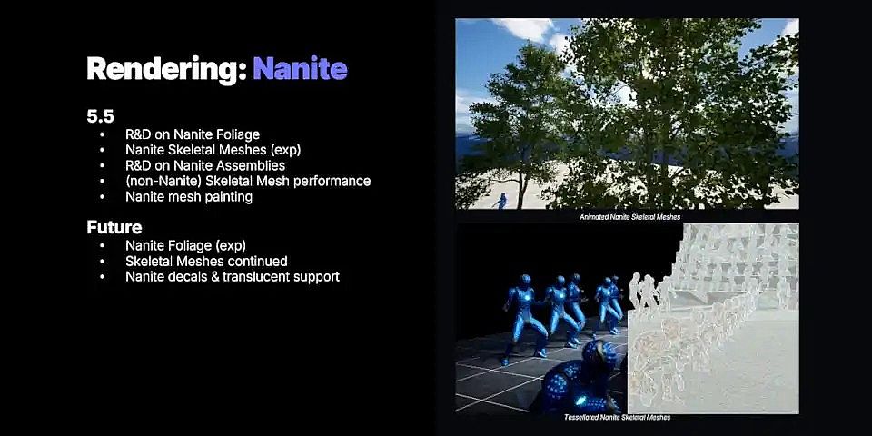 Unreal Engine 5.6將對**Nanite Foliage**(即在Nanite中支持樹木等資產)進行一些“重大更新”。幻燈片中提到“Nanite decals & translucent support”(Nanite貼花和半透明支持),可能指的是在Nanite中使用半透明混合模式的網格貼花支持。這項工作旨在解決動態移動樹木的渲染問題,并使Nanite Foliage與Unreal Engine的動態全局光照系統Lumen更好地協同工作。