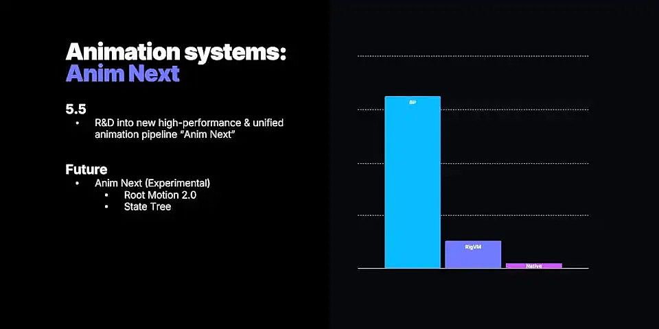 然而,Unreal Engine動畫方面最大的變化可能是Anim Next:一個“長期計劃,旨在整合所有動畫邏輯系統”。新的統一動畫渲染管線將比動畫藍圖更快、更易于使用,最終目標是取代動畫藍圖,消除將藍圖“本地化”為C++的需求。