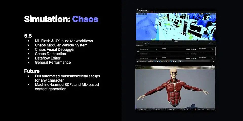 在Unreal Engine的Chaos Physics工具集中(包括軟體系統Chaos Flesh),Epic計劃“在[Unreal]編輯器內完全自動化肌肉骨骼模擬”。幻燈片中還提到新的機器學習功能,繼Unreal Engine 5.2中引入的ML Deformer之后,包括機器學習SDF和接觸生成。