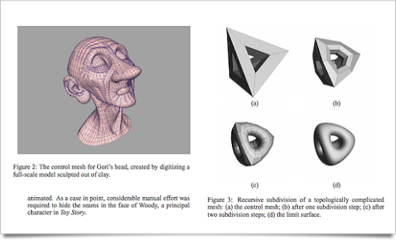托尼•德瑞斯對CG動畫制作界最為重要的貢獻,就是引入了高還原度的曲線/曲面的生成算法:如何將復雜的形狀分解成電腦可以生成的多邊形。多年以來,電腦動畫和電子游戲制作都在致力于用多邊形來表示一個真實世界的三維物體。但是,使用多邊形的問題就在于,仔細一看,還是看得出來多邊形的棱角的。CG業界的趨勢是用“平滑”曲面代替多邊形,這些“平滑”曲面會經過原來多邊形頂點所在的位置。數學家針對此方,發明了各種快速生成“經過固定點的‘平滑’曲面”的方法。