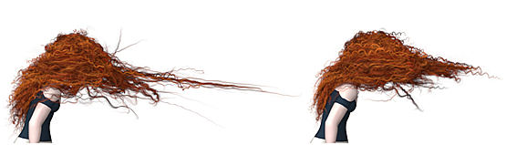 卷發絲模擬中用彈簧彎曲對比不用彈簧彎曲,在受力之后3幀的區別。來源:Pixar