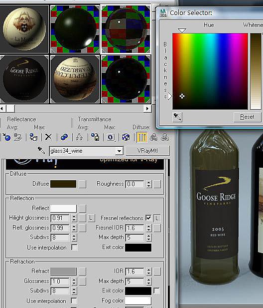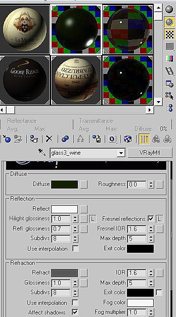 這是右邊的酒瓶,紅酒,有那么一點點的透明,而且玻璃本身是由顏色的。參數研究如上圖。主要是用了Fog Color的特性來調試。
