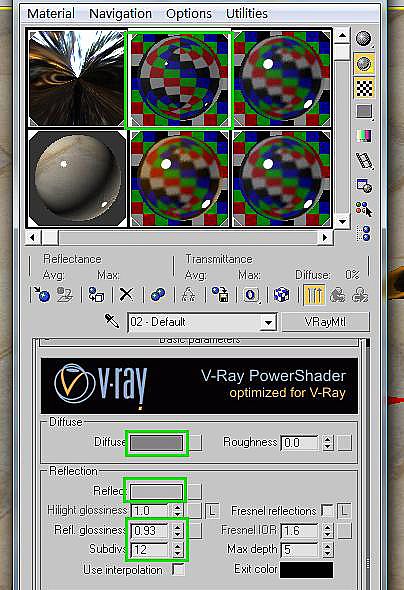 Subdivs: 這個值是反射表面的細分度,細分讀越高則模糊的表現越細膩,但要注意,此值越高,渲染所需的運算量會越大,一般不是特別的需要,就保持默認值8即可。