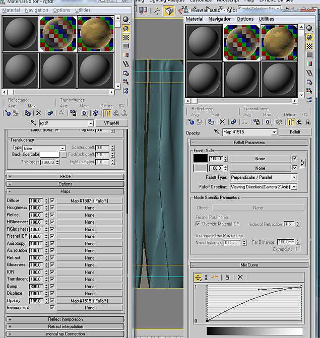 我們可以看到,這樣的調節方式,僅僅是在折射度的這個參數上,放上了一個FALLOFF貼圖來限定其透明程度即可。要注意的是折射率為1.01,這樣可以把透明物體的折射產生的扭曲降低到最小。