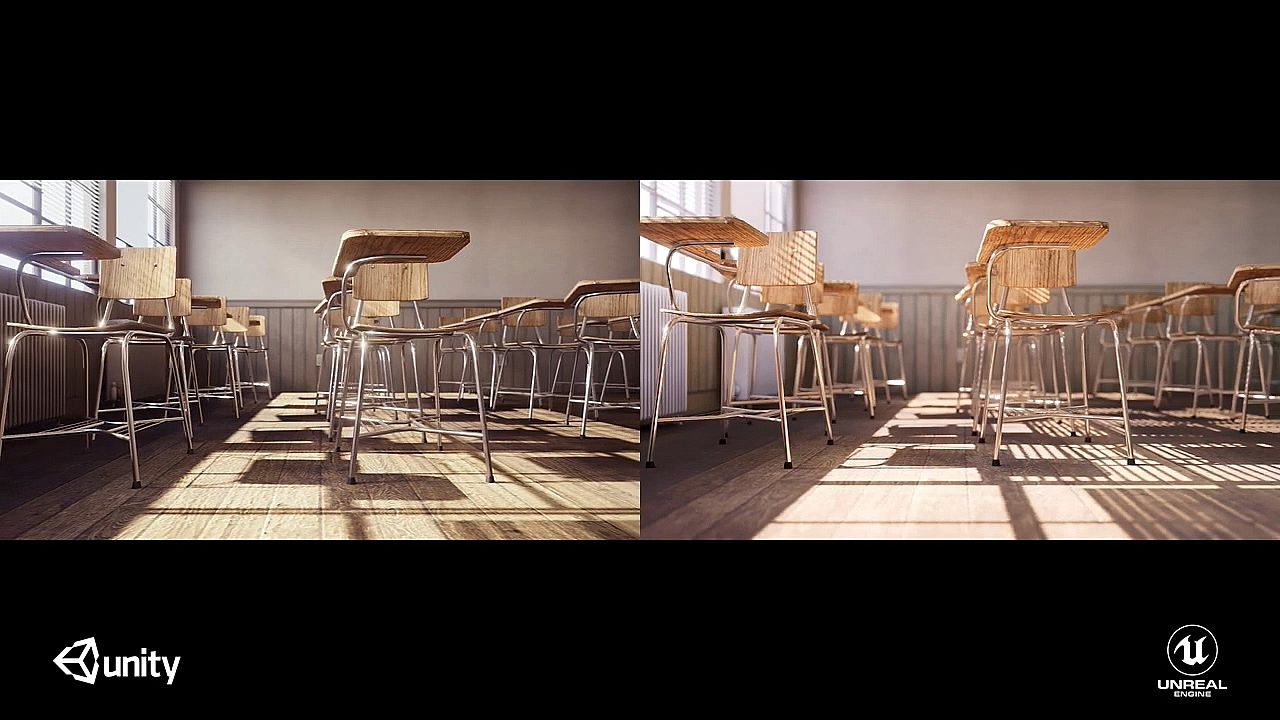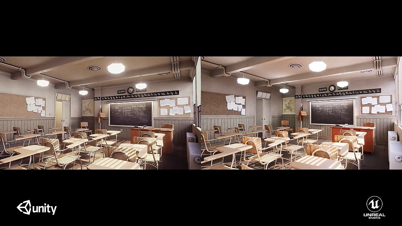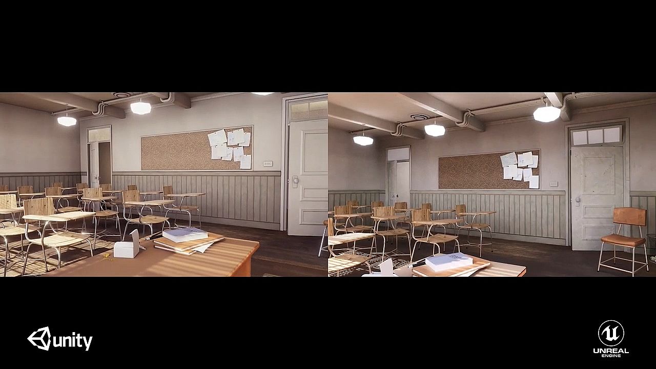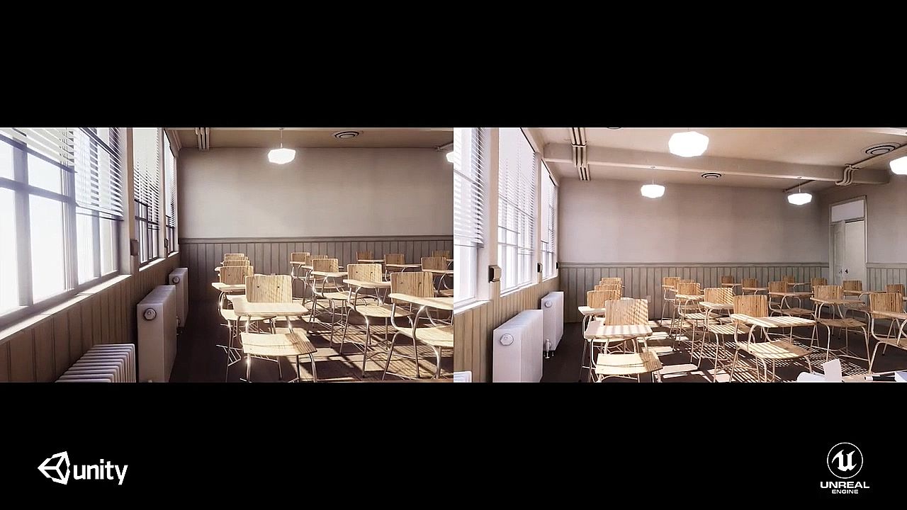 三維教室建筑室內(nèi)場景,UE4和Unity3d渲染質(zhì)感實(shí)測對比