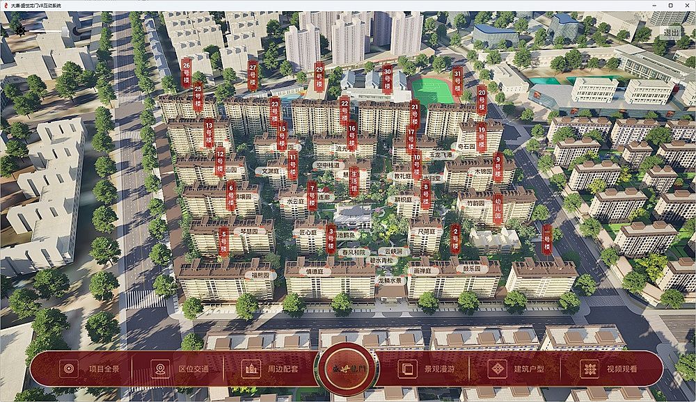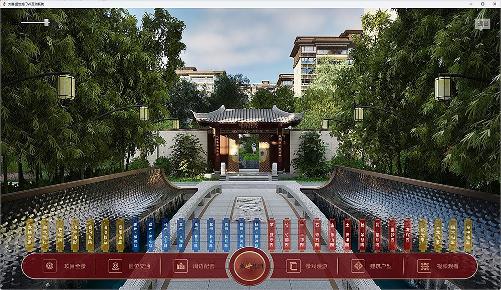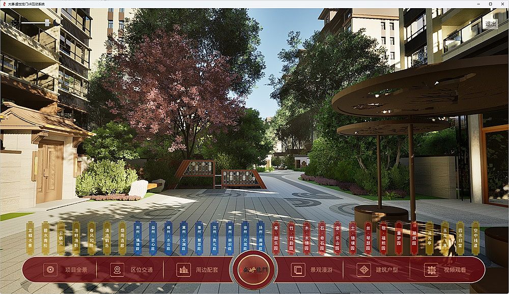 VR互動展示系統,使用UE引擎,全方位呈現整個小區的各個景觀節點,全景交互,可自由行走游覽。